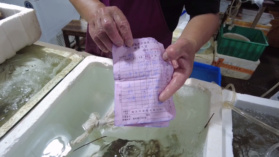 今天上午,在东江阴街菜市场海鲜摊位,进货购物单位写着“胖子”的摊位,摊主拿出一张进货单,向顾客兜售着梭子蟹,他表示,现在梭子蟹的价格,不管是鲜活的,还是冰鲜的,用上海话说便宜到“杀根"。他一口气报出了这些活蟹的零售价。小娘蟹3两左右35元一斤 ,大肉母4两左右48元一斤 ,大白蟹5两到8两的55元一斤。