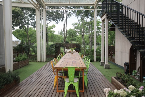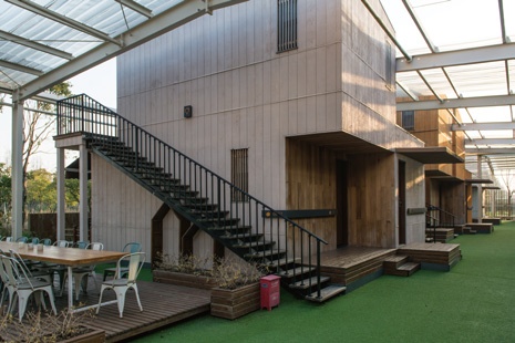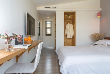 18个“创意盒子”,以搭积木的方式在仓库内构建成错落有致的小院。一楼的部分房间带有一个迷你院子,二楼的豪华大床房则配备观景阳台。最赞的是酒店长廊,有着孩子们喜欢的超大花坛(仓库的结构梁柱改成的立体绿化)。这里既是室内,又是室外,走出房门就能在蓝天下读书、喝茶,还可以在春秋季举办生日派对!