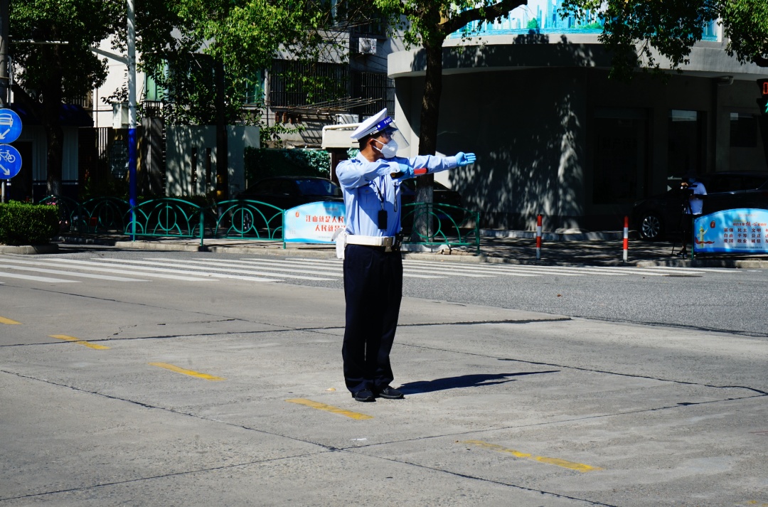 下午,在繁忙的十字路口,勤务辅警们不惧高温,一丝不苟地指挥、疏导交通。他们身上佩戴着的新版辅警号牌、胸徽和肩章,在阳光的照耀下,熠熠生辉。
