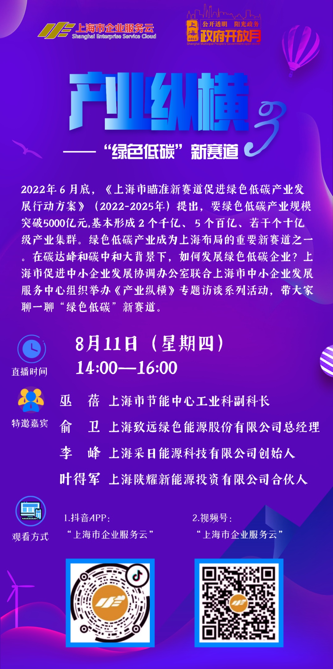 本次活动将邀请来自相关行业领域的专家为上海绿色低碳产业发展把脉,提出建设性观点。活动通过直播访谈的方式,在“上海市企业服务云”官方抖音号和视频号《产业纵横》栏目进行直播。