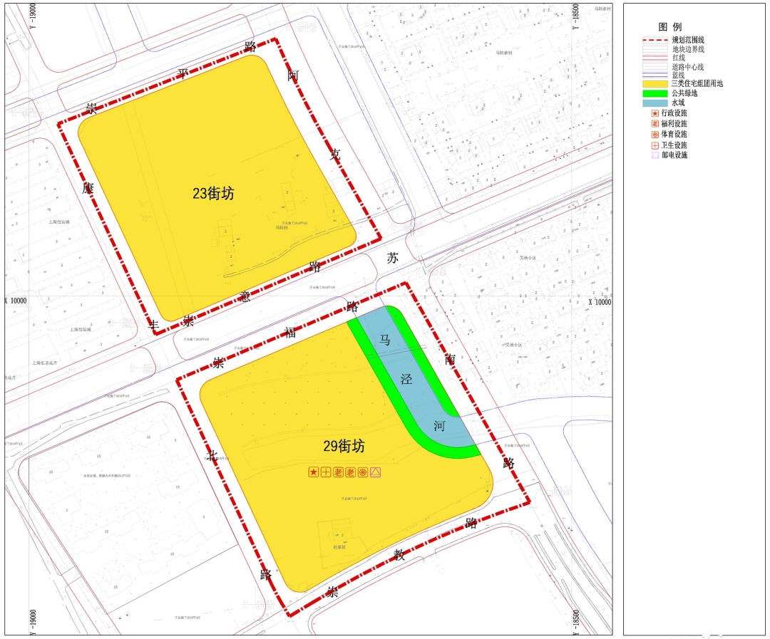 本次规划调整涉及马陆南社区JDC1-2301单元23、29街坊,23街坊东至阿克苏南路、南至崇意路、西至康丰北路、北至崇平路;29街坊东至阿克苏南路、南至崇教路、西至康丰北路、北至崇福路。