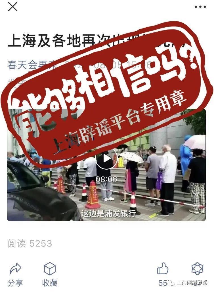 近日,不少自媒体转发一则视频称,从6月初到现在,上海部分银行门口老是排着长长的队伍,排队人群中有不少老年人,但银行“每天只发40个号”。上海辟谣平台对视频内容核查比对发现,相关视频为今年6月上海全面恢复正常生产生活秩序初期的情况。当时因防疫要求,部分银行网点采取限制人数、增加消杀时间、缩短营业时间等措施从而导致排队现象。记者获悉,近期上海各银行营业网点秩序均正常有序,并未出现视频中所播放的排队现象。