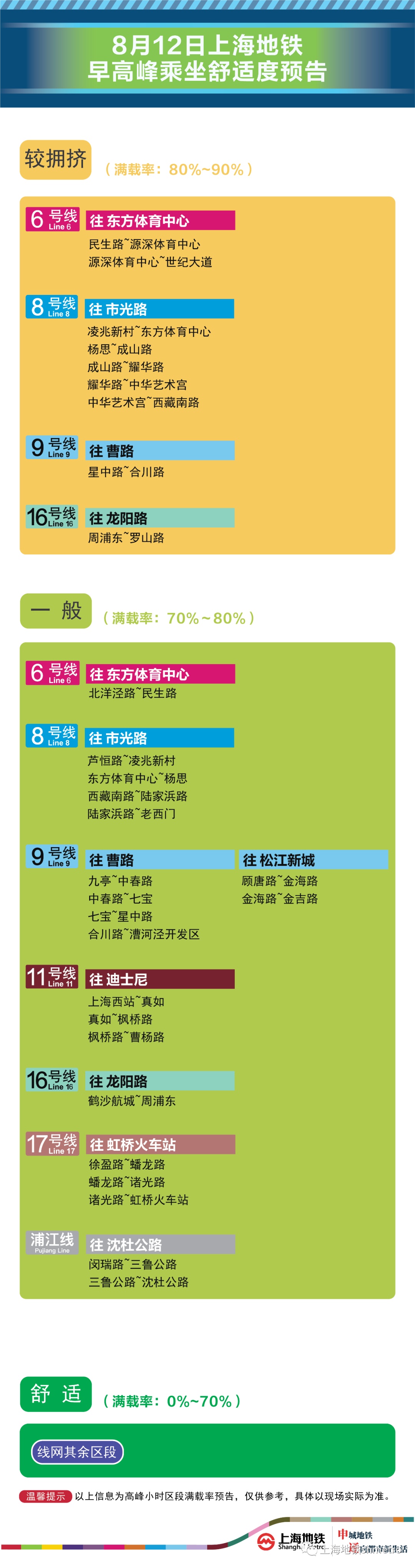 为提升上海地铁早高峰期间出行服务水平,提升乘客乘坐体验,上海地铁向乘客提供乘坐舒适度预告,方便乘客提前做好出行准备。