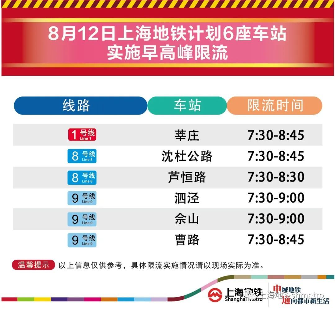 8月12日,上海地铁早高峰限流措施将继续实施,届时将有6座地铁站早高峰计划限流。