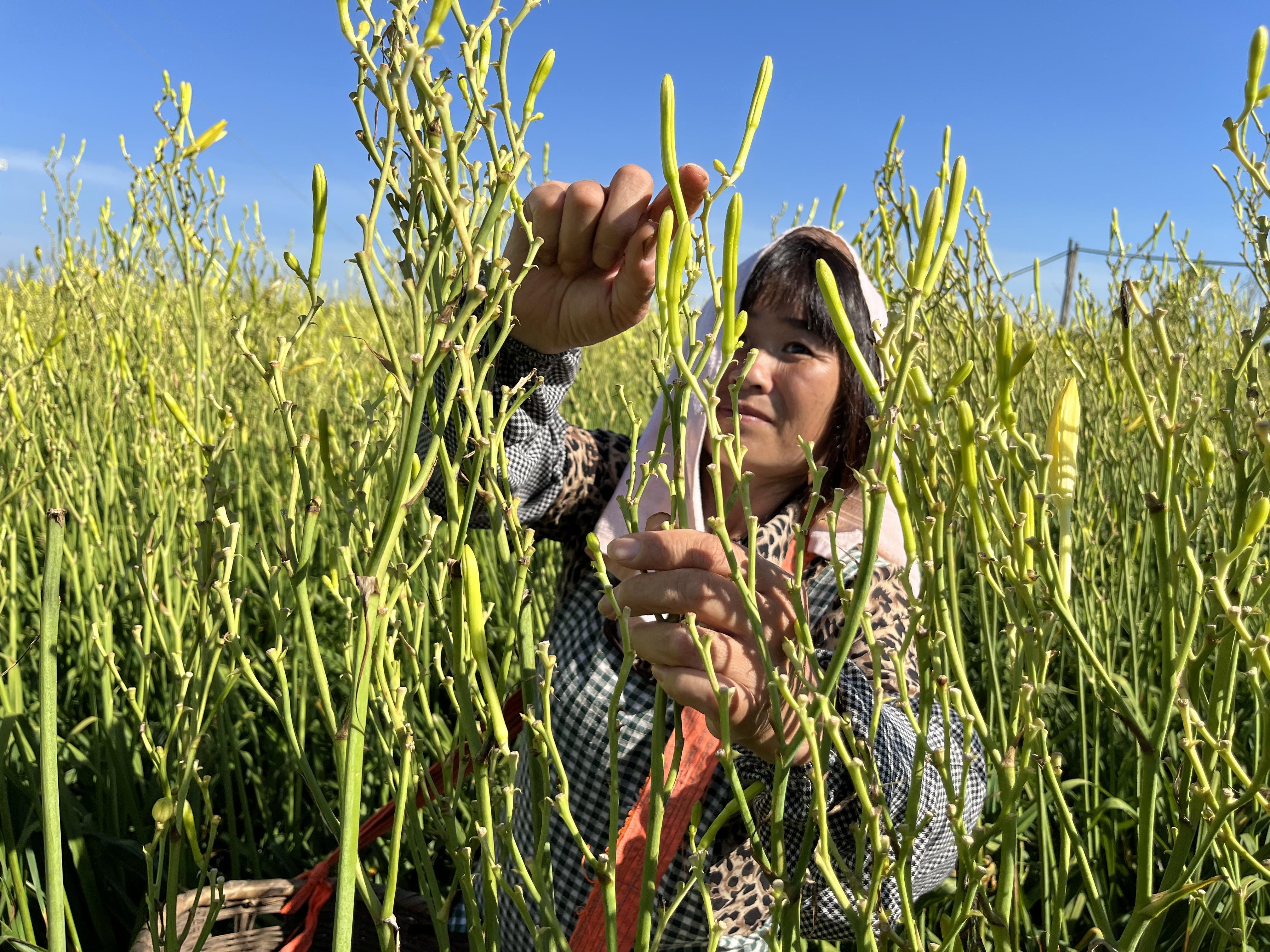 8月9日一大早,在五宅村这片黄绿相间的田地里,村民们提着篮筐来回穿梭,一双双巧手上下飞舞,很快一朵朵未开放的黄花菜被迅速收入筐中。“采花人告诉记者,黄花菜花蕾中部色泽金黄、两端呈绿色时采摘口感最佳。为了保证黄花菜的品质,大家都是凌晨四五点开始就下地采摘,一般采摘到八九点就结束了。
