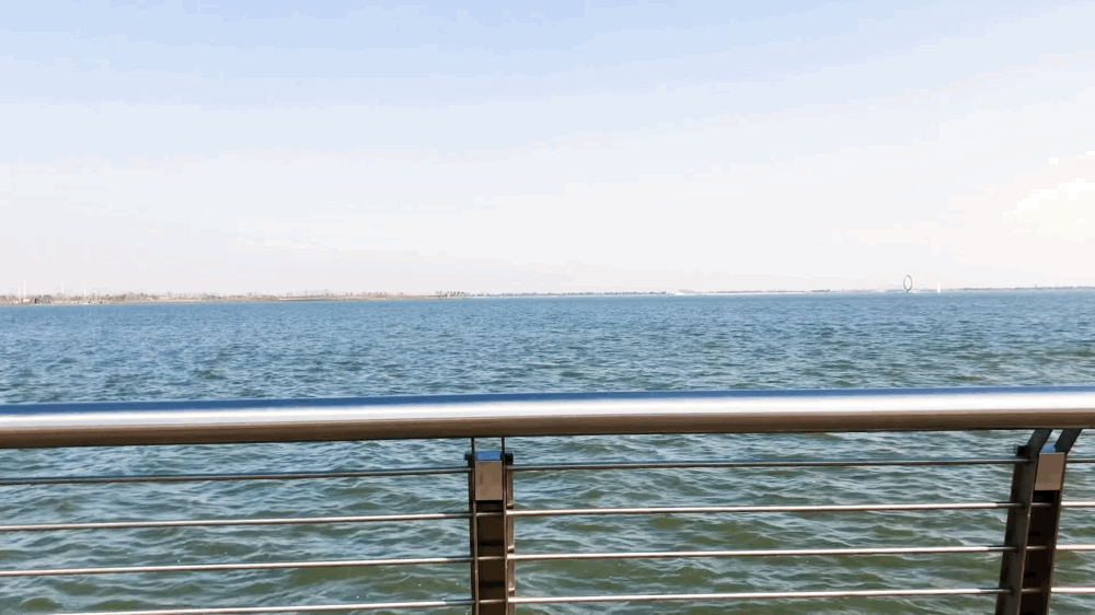 从滴水湖地铁站1号口和2号口之间的下沉式广场的扶手梯上来,长长的电梯慢慢地上行,在电梯最后一段没入地面的瞬间,你会看见一片蔚蓝,随之映入眼帘的就是滴水湖如海般辽阔的湖面,令人在酷暑中感到心情舒畅。