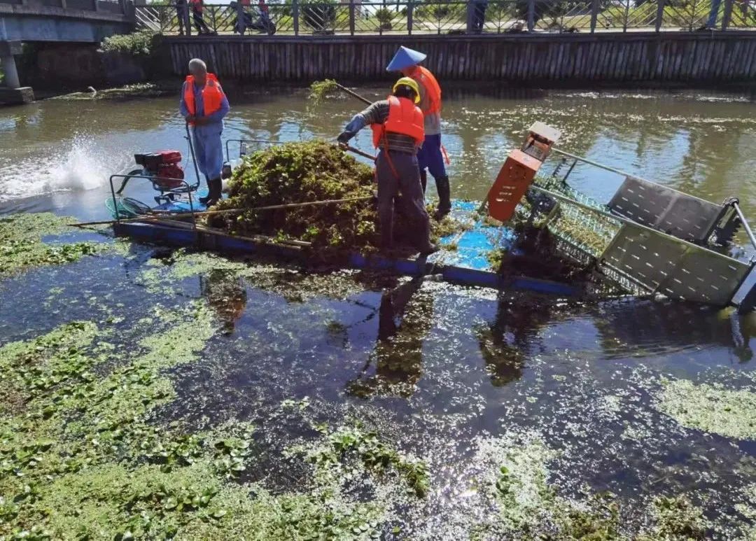 此外,今年漕泾镇购进两台水草打捞机,哪里绿萍、水葫芦积聚严重,就首先使用机械打捞。通过传送带将河中绿萍等水生植物运送至船舱,对生长旺盛的水葫芦还可以先剪碎后再进入传送带。操作员说:“机械打捞方便安全,效率成倍提高。”
