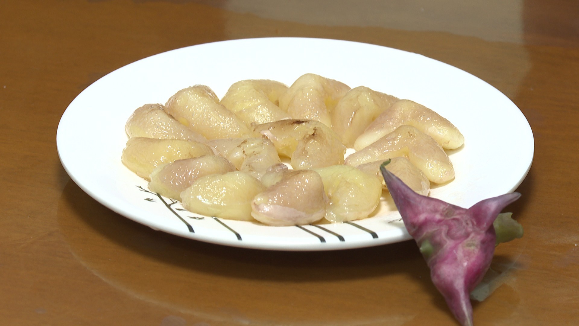 庄阿姨一边剥菱,一边向记者介绍红菱的吃法:“现在本地头茬红菱刚刚成熟,口感最为鲜嫩,虽然菱角也可生食,但一定要清洗干净,炒熟吃最为安心。”剥好后的菱角形似元宝,白白嫩嫩,下锅清炒,口感甜糯清脆,无需多加调料就很美味。