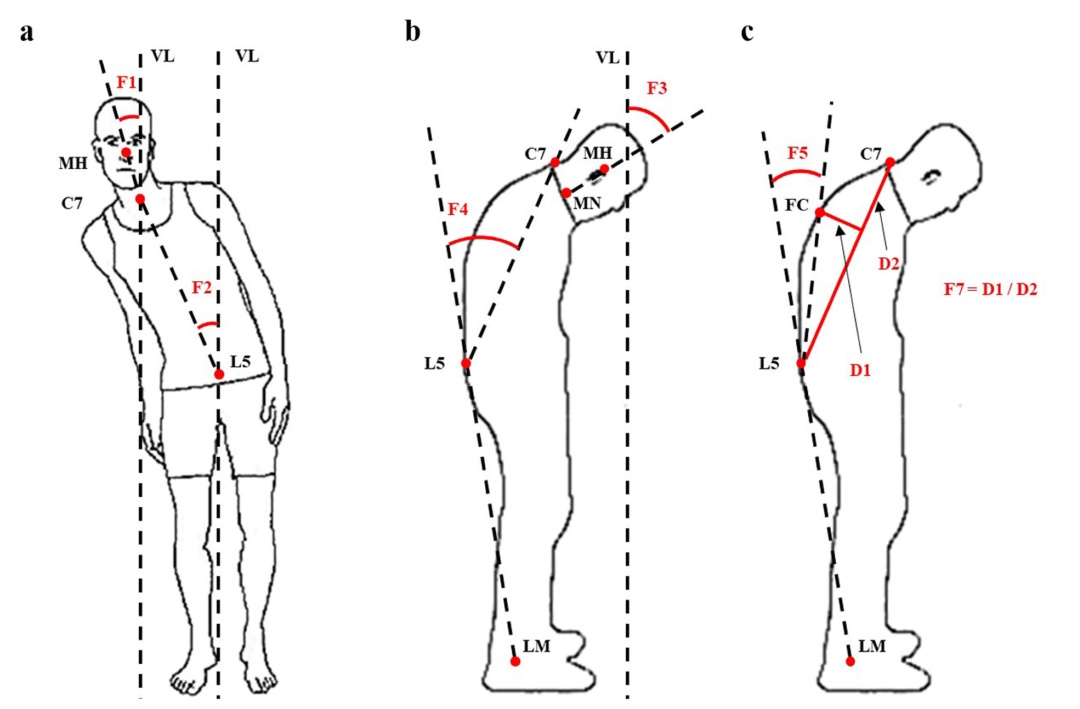 图1. 六个所选参数F1、F2、F3、F4、F5 和 F7 的示意图。缩写:MH,头部中点;MN,颈部中点;VL,地面的垂线;C7,第七颈椎棘突;L5,第五腰椎棘突;LM,外踝;FC,脊柱最突出点。