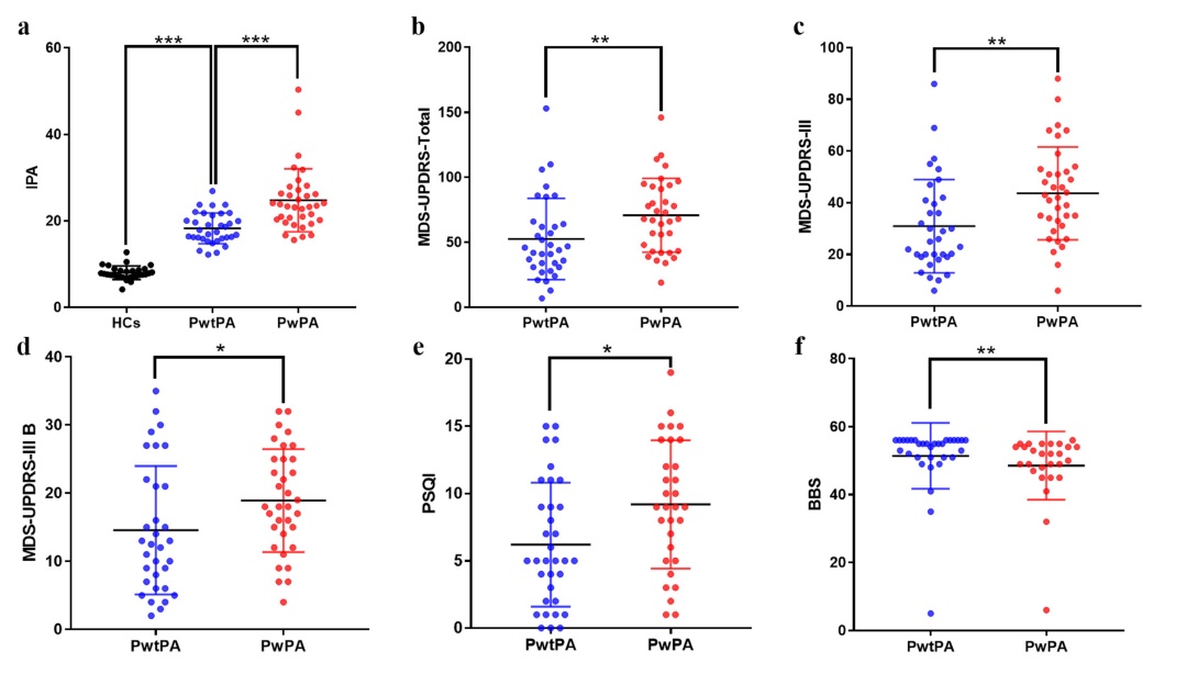 图2. 受试者的床特点。(a)PD患者和健康对照之间,以及PwPA与PwtPA组之间的IPA比较;(b-f) PwPA与PwtPA组之间的临床评估比较。缩写:PwPA,有躯干姿势异常;PwtPA,无躯干姿势异常;HCs,健康对照;IPA,躯干姿势异常指数;MDS-UPDRS,运动障碍协会赞助的统一帕金森病评定量表修订版;PSQI,匹兹堡睡眠质量指数;BBS,Berg平衡量表。*表示p < 0.05;**表示p < 0.01;***表示p < 0.001。