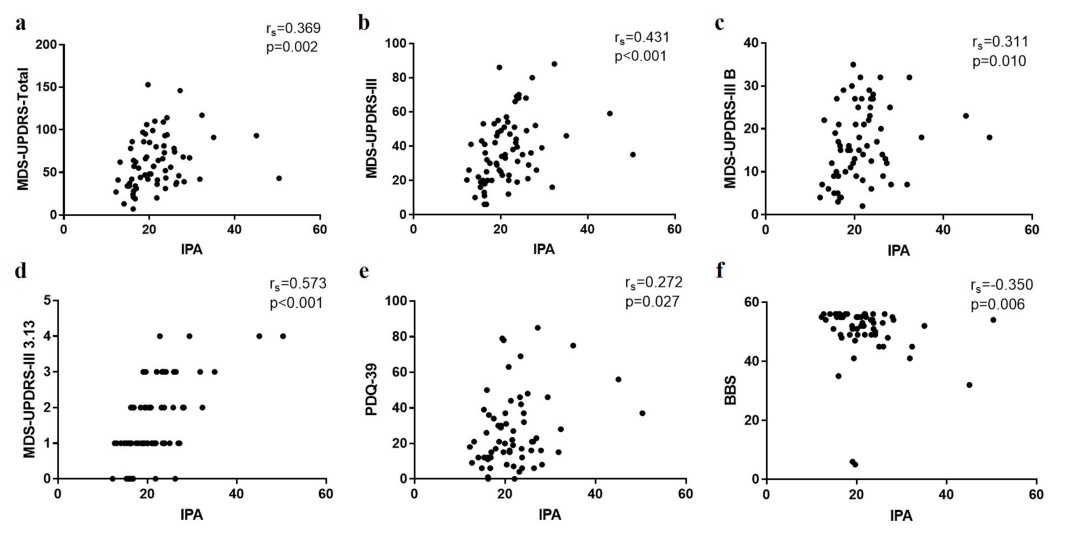 图3. IPA与临床评估的相关性。Spearman相关分析显示IPA与MDS-UPDRS, MDS-UPDRS-III, MDS-UPDRS-III B, MDS-UPDRS-III 3,13, PDQ-39和BBS等临床量表评分显著相关(a-f)。缩写同前。