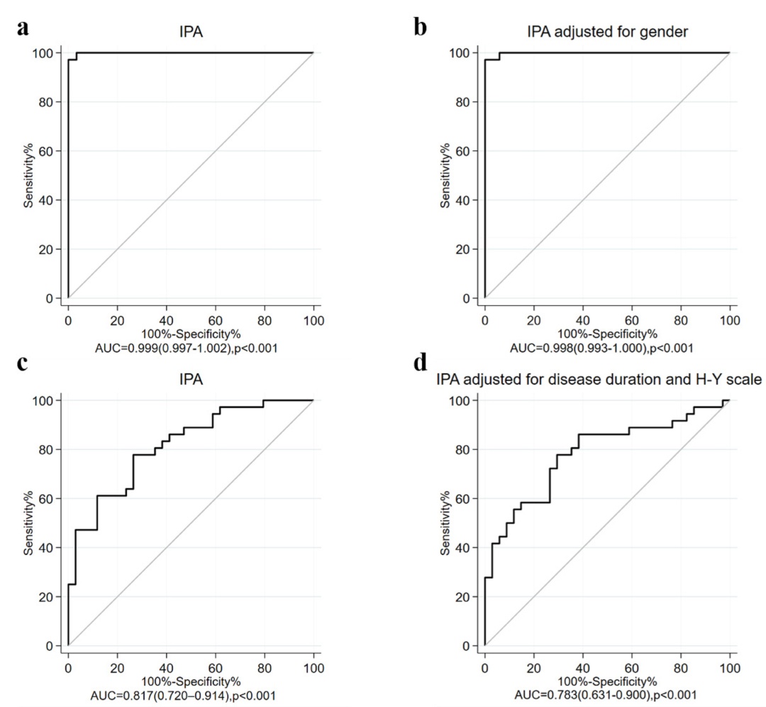 图4. ROC分析用于确认IPA的最佳临界值。用于区分PD和健康对照的ROC曲线,调整(b)和未调整性别(a)。用于区分PwPA和PwtPA的ROC曲线,调整 (d)和未调整病程和Hoehn-Yahr分级(c)。缩写同前。
