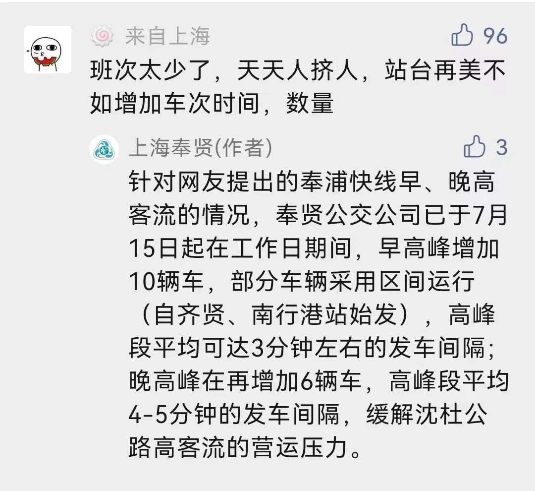 关于高峰时段增加班次方面,我们根据奉浦快线客流实际情况,优化调整班次密度,于工作日早高峰增加10辆营运车辆、晚高峰增加6辆营运车辆,将班次间隔由6-8分钟调整至3-5分钟,缩短乘客的候车时间,解决高峰期间客流量骤增带来的“乘车难”的问题。