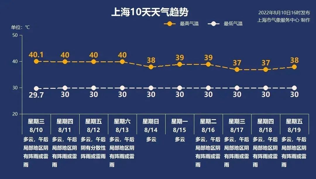 未来十天,副热带高压仍然强盛,上海会出现持续37℃以上的酷暑日,极端最高可达40-41℃。今起三天,上海最高温天天冲击40 ℃,市民要注意防暑降温。