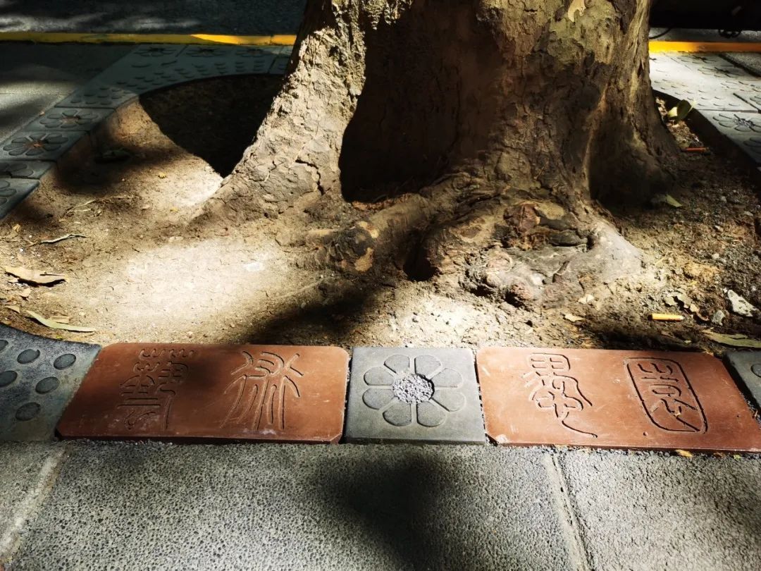 红色的长砖,每块上写两个字,每个树穴更换两块砖,灵动又充满历史底蕴的字体,让路过市民能够更多了解美丽街区的主题。