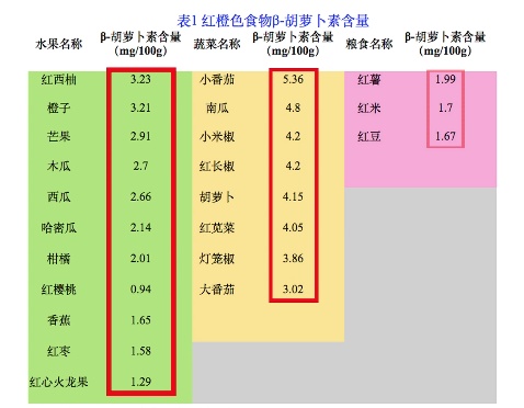 在红橙色蔬菜中,小番茄、南瓜、小米椒、红长椒、胡萝卜、红苋菜等,它们的β-胡萝卜素含量均大于4毫克/100克,其中小番茄含量是最高的,可以达到5.36毫克/100克。