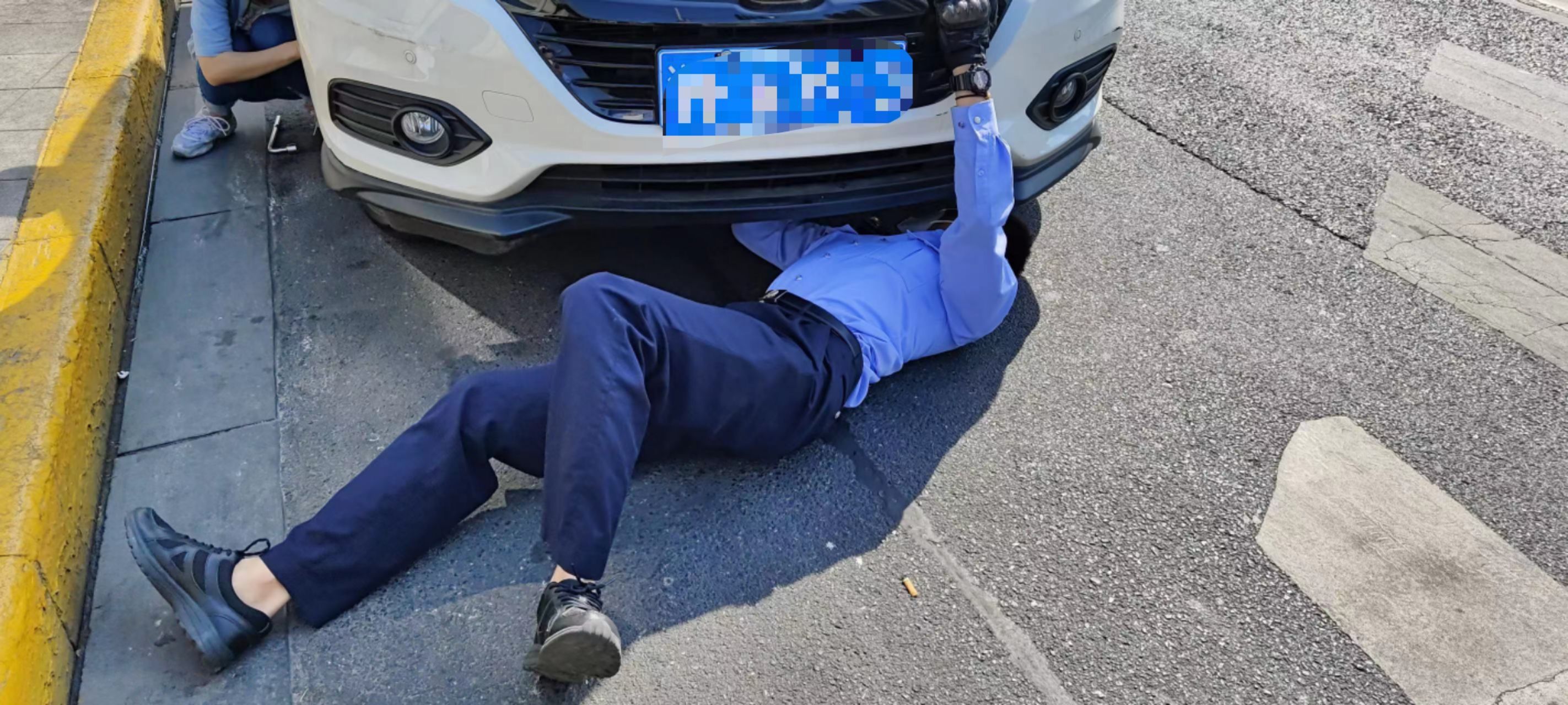 由于引擎盖内部件布局紧凑,没有办法看清楚小猫所在的具体位置,张敏翼趴到车子底下,从缝隙中查看,找到了小猫所在的位置。经过一番努力后,小猫被成功解救的同时,也保障了车辆的行车安全。