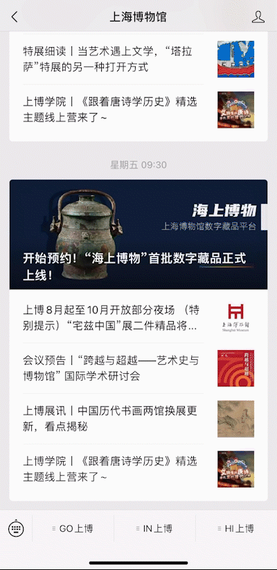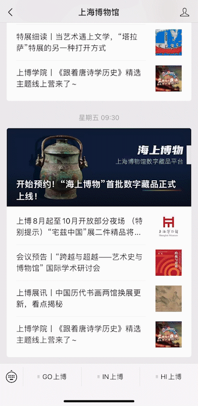 “上海博物馆”微信公众号的菜单栏分为三大版块:GO上博、IN上博和HI上博,集参观预约、线上导览、特展回顾、上博课程、文创商店等多功能为一体,全方位满足观众的多样化需求。