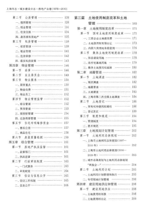 3、第三篇土地使用制度改革和土地管理,记述了1978-2010年间,上海在土地使用制度改革、地籍管理、土地规划计划管理、建设用地供应和管理、耕地保护和基本农田建设、土地综合管理等方面等改革发展和成果;