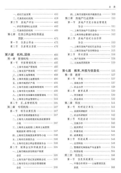 3、第七篇教育、科技与信息化,记述了上海房地产行业教育、科学技术、行业信息系统的发展情况和行业报刊、杂志的创办情况;
