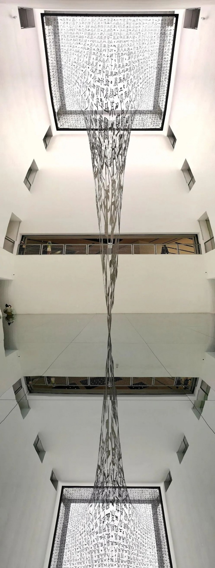 “徐冰:引力剧场”展览今天正式开幕。由中国著名当代艺术家徐冰为全球独一无二的艺术空间——净高33米的浦东美术馆中央展厅量身定制的大型装置作品,“引力剧场”通过镜面反射,视觉纵深超过50米。观众从地下1层至4层,都有不一样的观感。