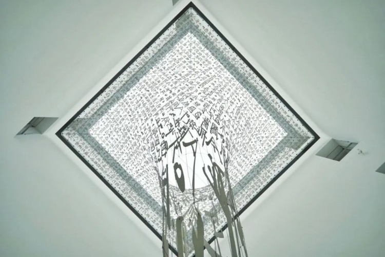 受透视影响,文字被拉伸变形,并经展厅底部巨大镜面反射,凸显出作品与空间相互“穿透”的纵深感。徐冰介绍,这件作品中“英文方块字”的原文本,摘自哲学家维特根斯坦探讨“观看”与“面相”的一段文字,提示“语言”对人类所带来的认知扭曲倾向。他希望借此表达在当今世界,不同文明、不同种族如何相互理解,人类如何才能携手并进。