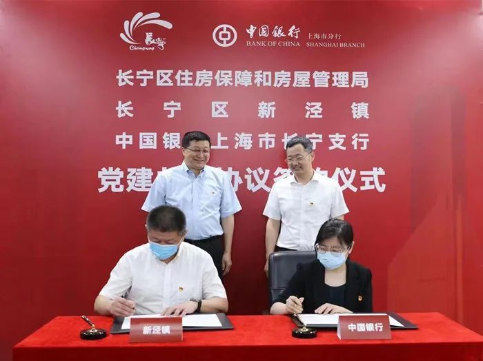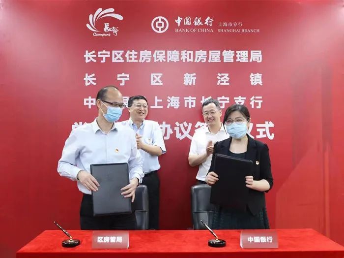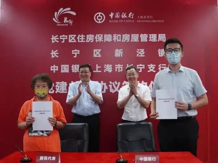 现场,新泾镇居民代表与中国银行上海市长宁支行签署了中银安梯分期业务协议。长宁区房管局党组、新泾镇党委与长宁支行党委共同签署了党建共建协议。