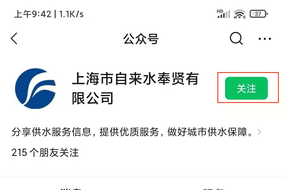 1、打开“微信”,搜索“上海市自来水奉贤有限公司”公众号,并点击“关注”