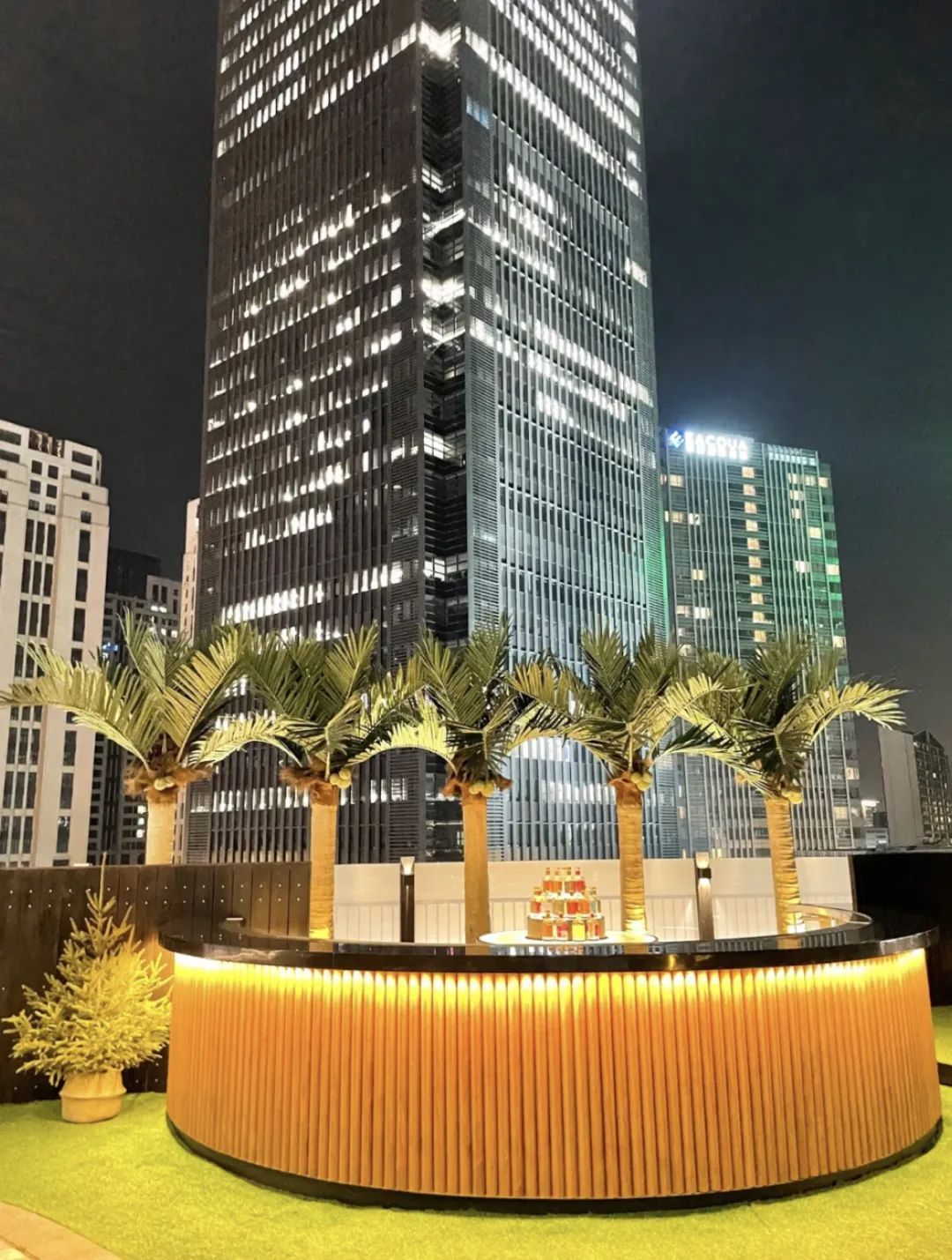 顶楼玻璃地砖下是沙子覆盖,加上仙人掌绿植和仿真骆驼的装点,度假氛围感十足,时髦北非风情大片随手拍,在此来一场烛光晚餐再合适不过了。