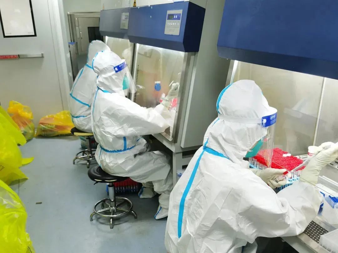 方舱实验室内的医务人员也在加紧完成核酸样本检测,每日每位工作人员人均完成2000管次检测。防护服里汗水早已浸透,他们依然一丝不苟地忙碌着,以最快速度出具检测报告。
