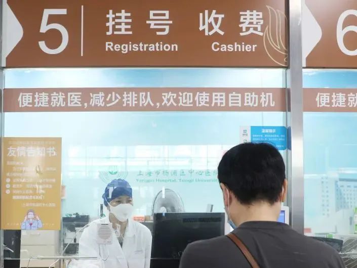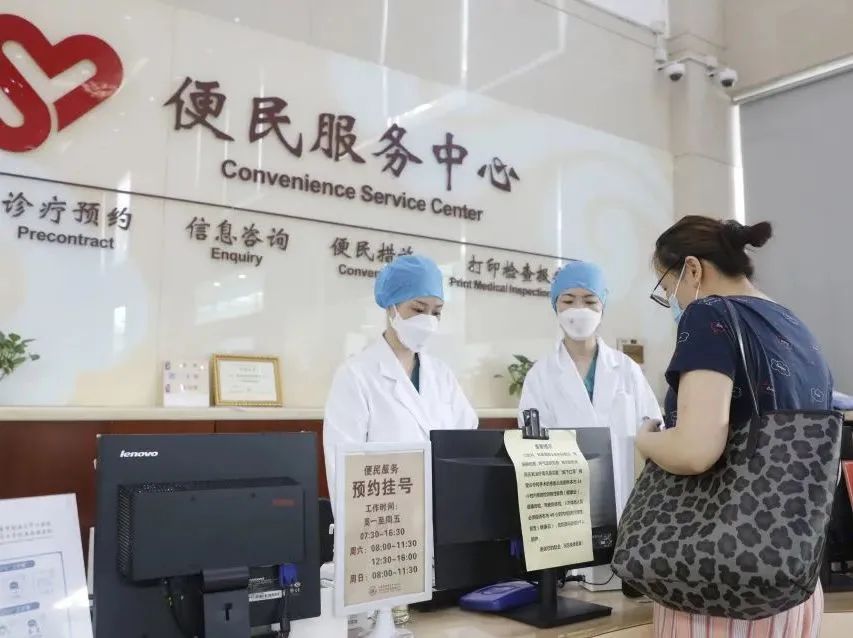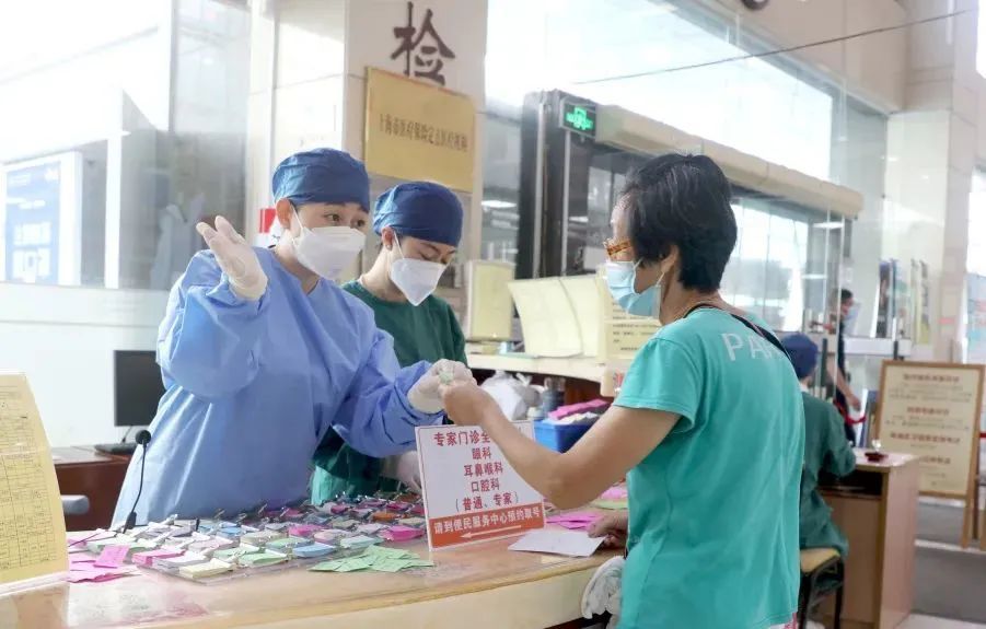 早上八点,门诊大厅里就已排起了长队。在院内流调预检、预检台、及便民服务中心,医务人员身着防护服,全心全意服务患者。窗口的工作人员也开始了一天的忙碌,为减少患者就医等候时间,窗口提前开、自助设备增加志愿者和实行分时段预约制。