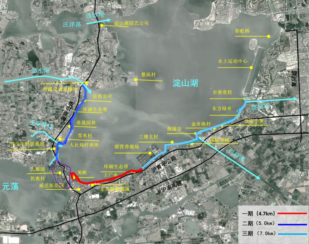 淀山湖堤防达标及岸线生态修复工程项目以“十四五”基本完成为总目标,按照“一次规划、分期实施”原则,结合区域空间规划和总体开发建设计划,分三期实施。其中一期工程实施范围东起牛尾巴港、西至杨舍村江,全长4.7公里,工程投资约2.25亿元,工程占地约108亩。工程主要建设内容包括新建改建护岸约4.7公里,新建贯通道路约2.6万平方米,新建桥梁4座、新建水闸3座,配套景观绿化约3.5万平方米。