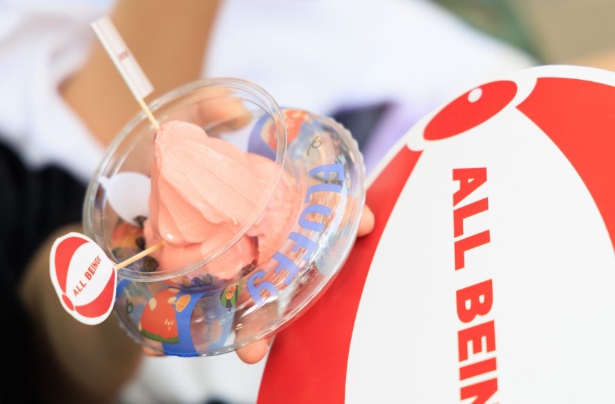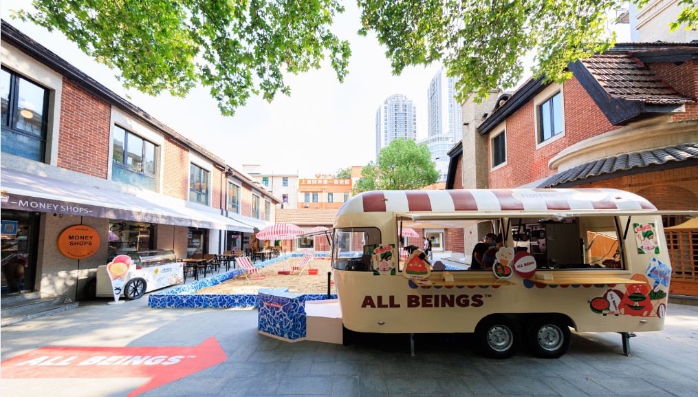 开业正值高温,ALL BEINGS以夏日泳池为灵感推出快闪活动,在愚巷打造了一处沉浸式体验沙滩场景,市民在感受“海滩游玩”乐趣之时,还可参与活动免费领取限定口味冰淇淋。同时,在门店内任意消费,能抽取BLACK STAR PASTRY、堂屋糖水铺、WABI COFE等愚园路商户的店铺产品兑换券,百分百中奖。