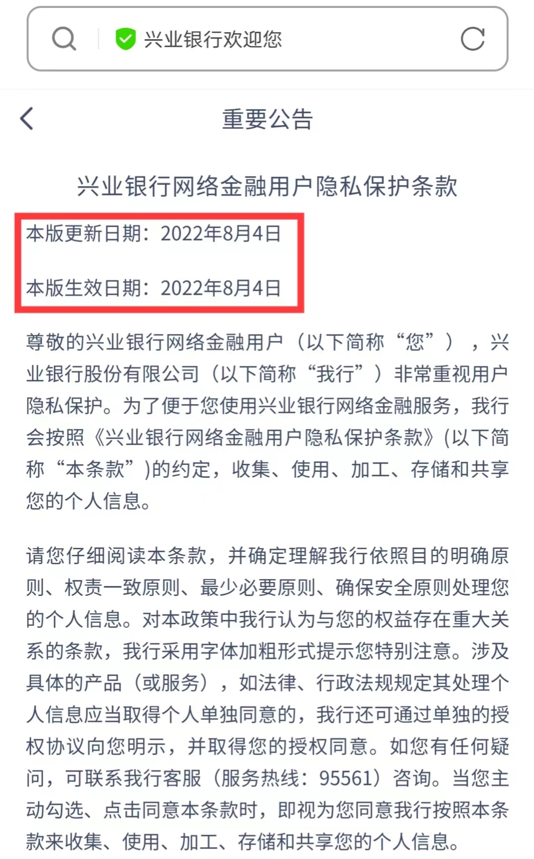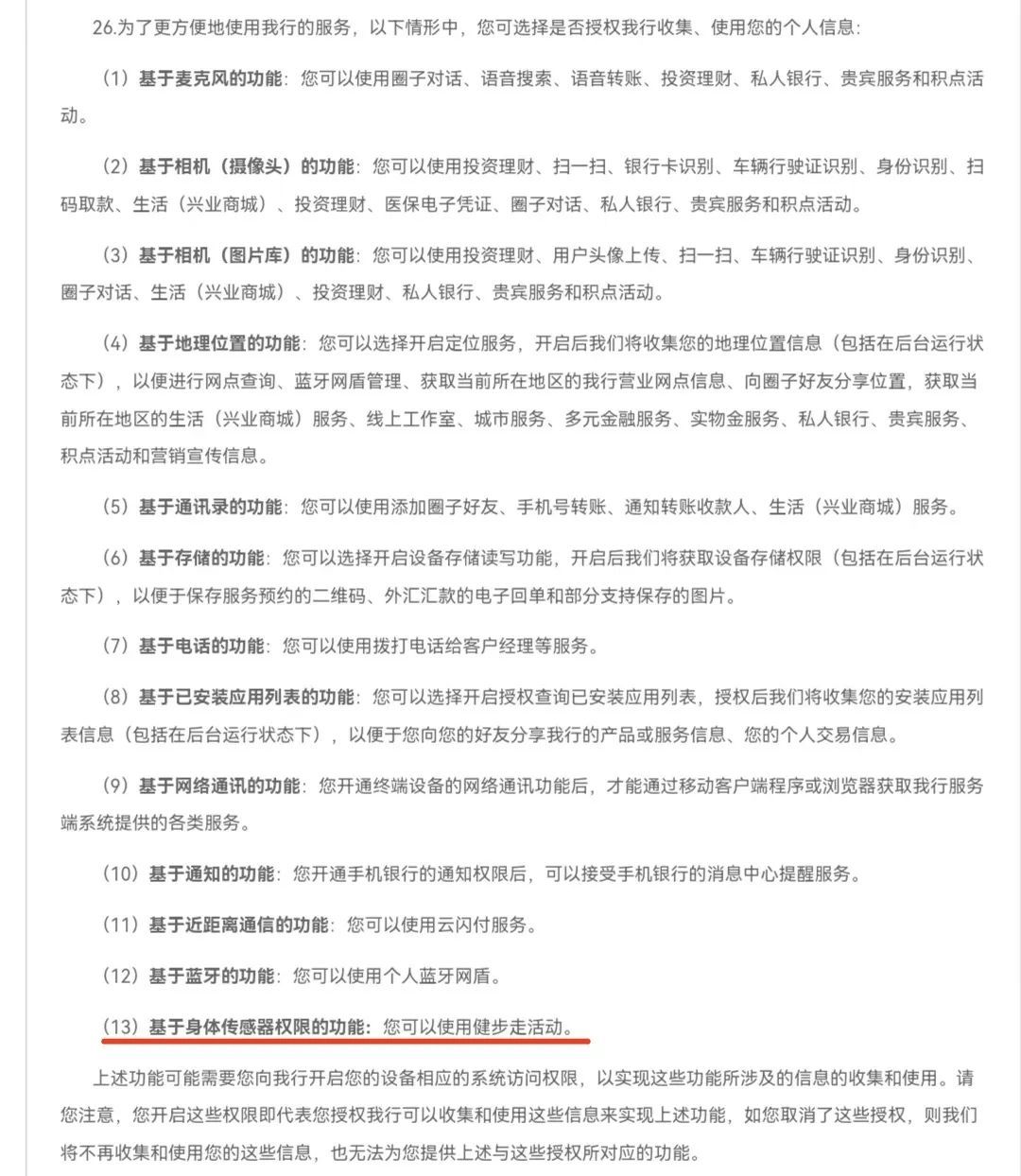 兴业银行表示对上海市消保委提出的建议高度重视,为保护客户知情权,该行已于8月4日当天就更新了《用户隐私保护条款》,对“身体传感器”权限用途做出清晰的说明。