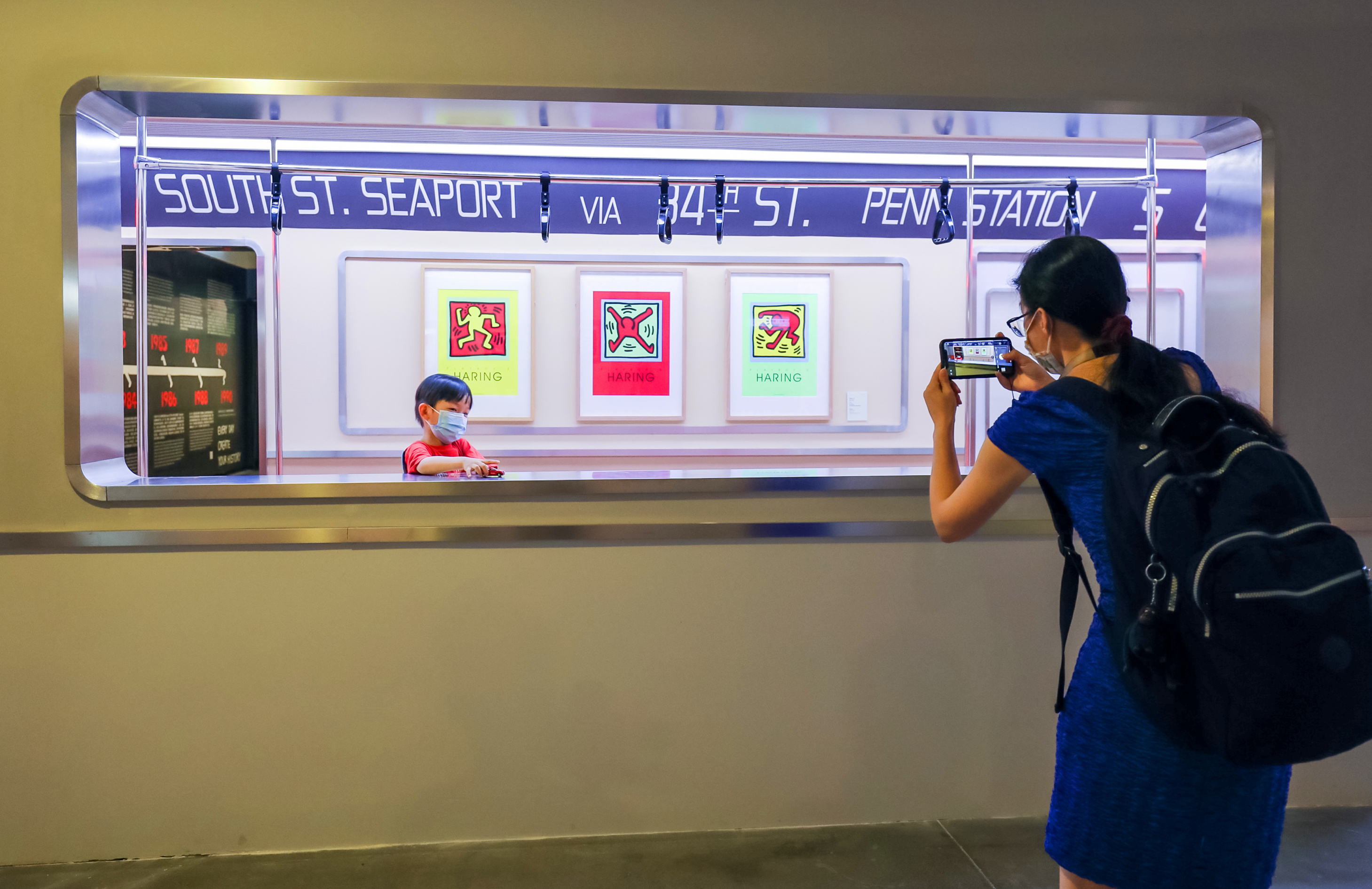 展览现场还“再现”了纽约地铁,这个凯斯·哈林街头艺术创作的起点。遇见博物馆借鉴凯斯·哈林艺术作品中的经典视觉形象和图案符号,对场馆进行全新设计,通过地铁、酒吧、商店等布景再现了凯斯·哈林艺术创作的场景。