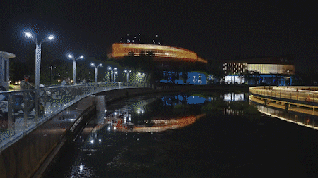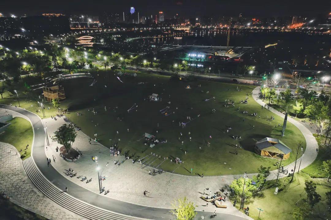 当夜色升起,公园的绿地草坪上满是搭帐篷、放风筝等休闲娱乐的市民,金海湖畔,旖旎多彩的灯光下,三三两两市民骑车、散步,享受这夜游上海之鱼的浪漫与惬意。