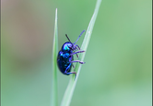 中华萝蘑肖叶甲,浑身散发蓝紫色的金属光泽,无毒不臭不咬人。