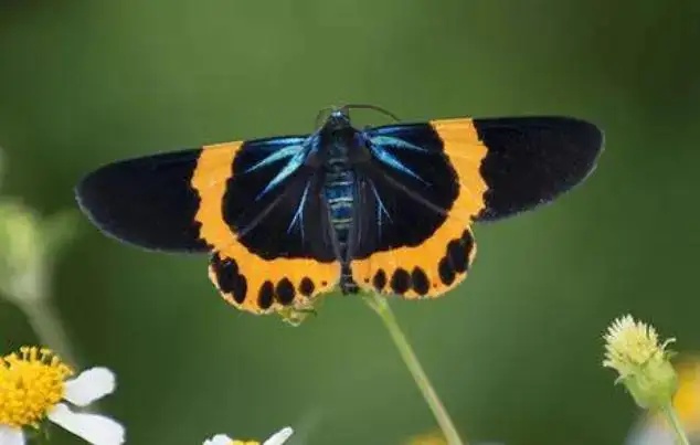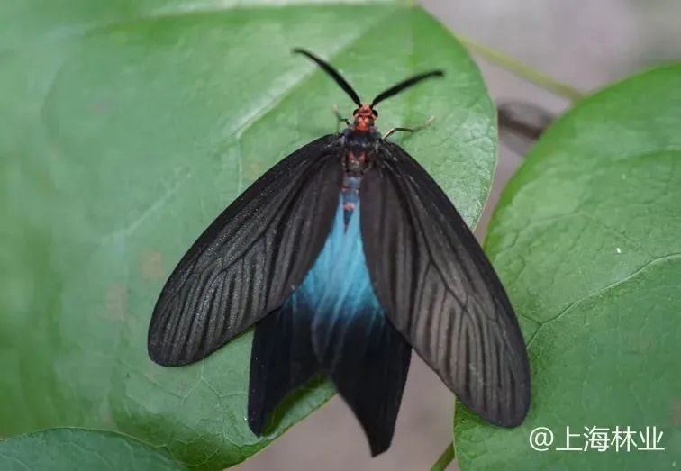 重阳木锦斑蛾:前翅黑色,反面基部有蓝光。后翅亦黑色,自基部至翅室近端部蓝绿色。
