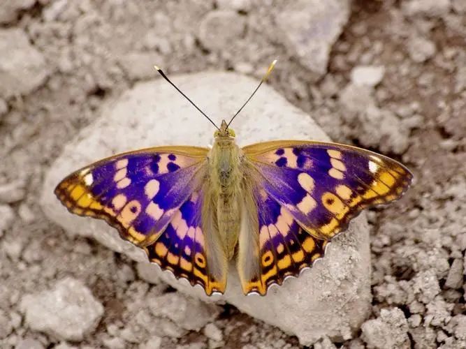 斐豹蛱蝶,雄蝶翅橙黄色、后翅外缘黑色、具蓝白色细弧纹,翅面有黑色圆斑。雌蝶前翅面端半部紫黑色,有一条宽的白色斜带。