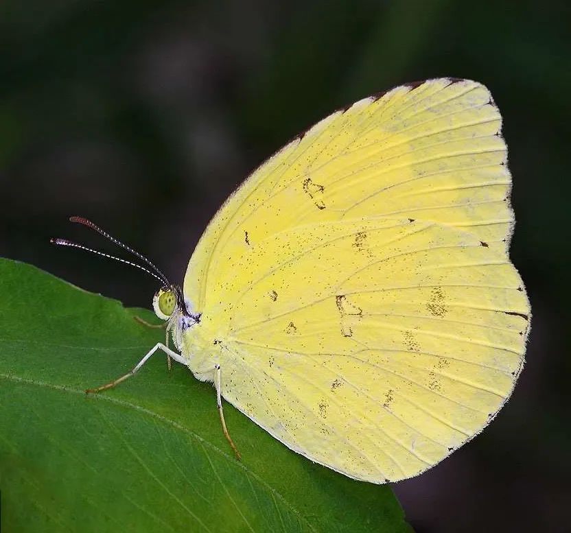 宽边黄粉蝶,翅色鲜黄色,缘毛基本为黑褐色。成虫喜访花吸蜜,喜欢停息于植物反面。