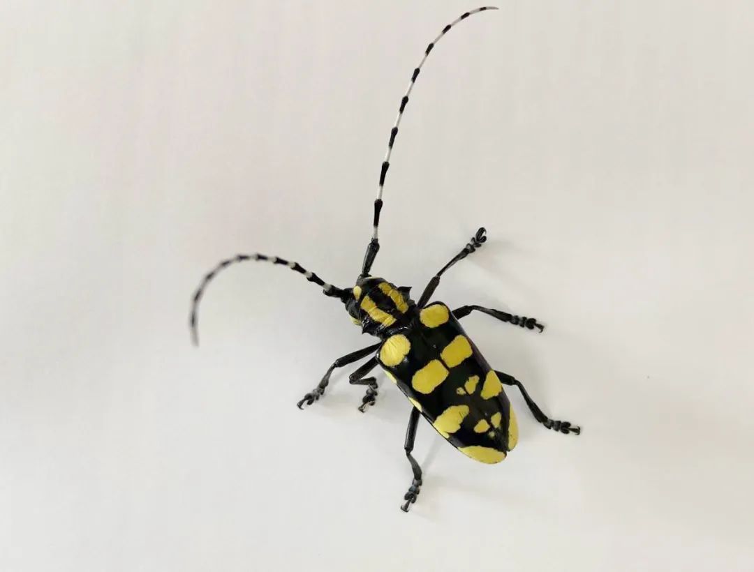 楝星天牛,成虫全身布大型黄色绒毛斑块,排成4行。