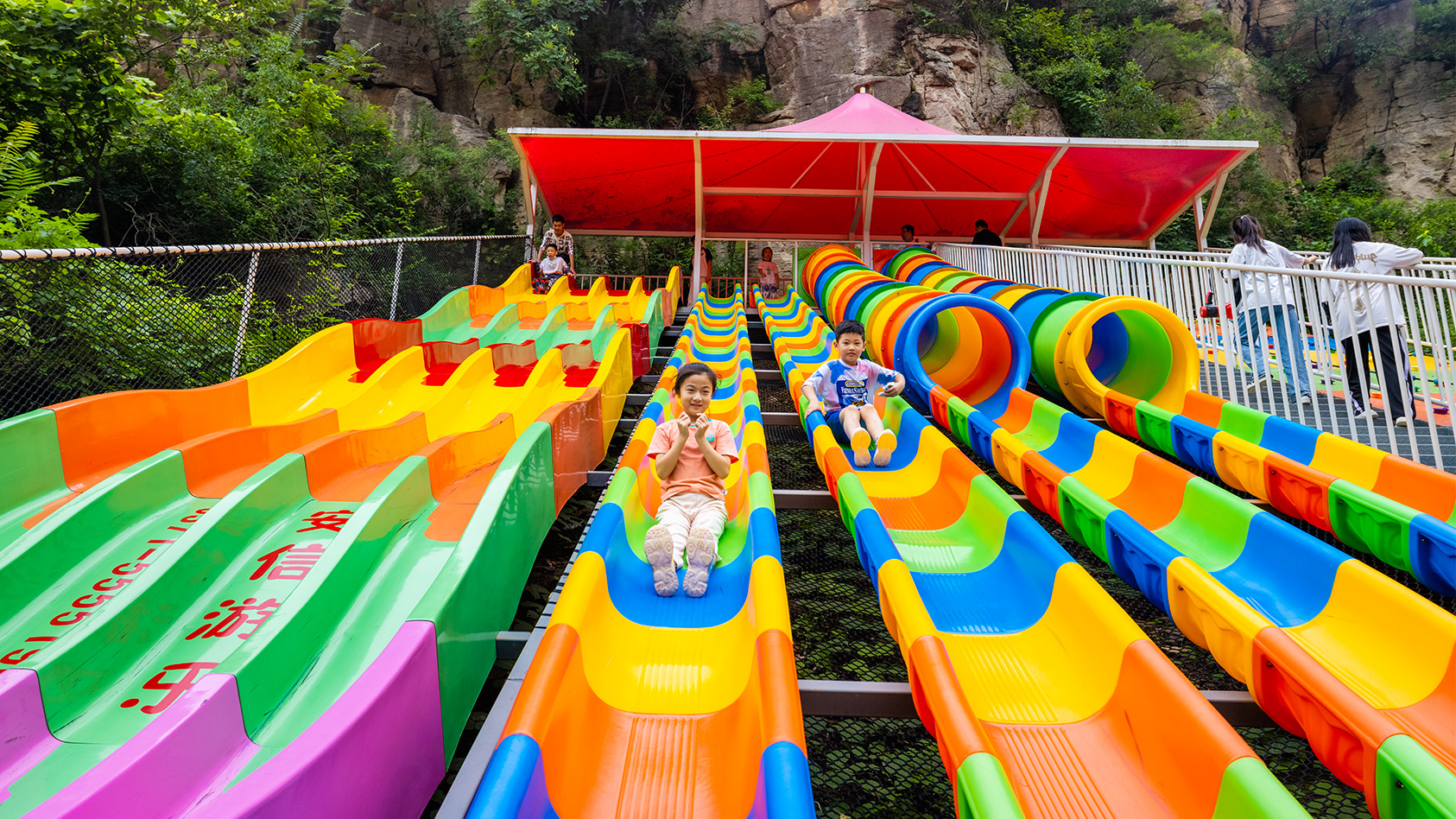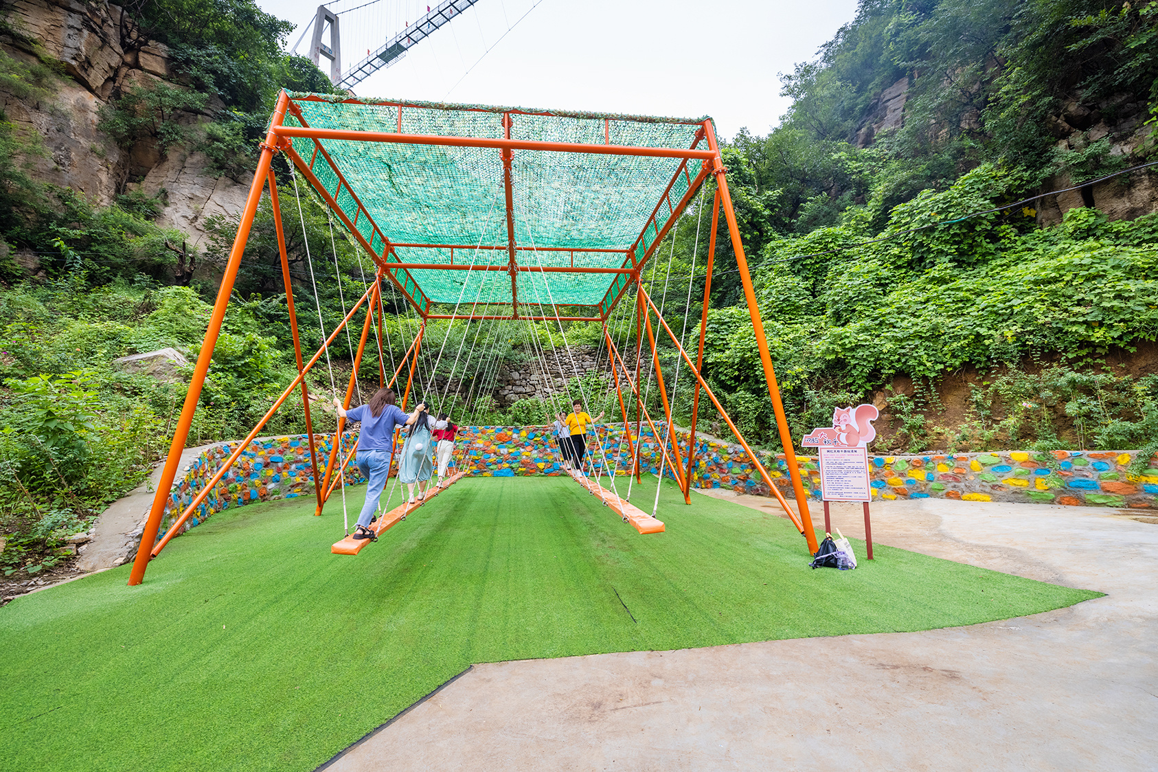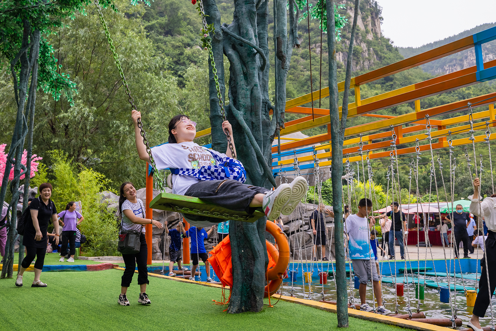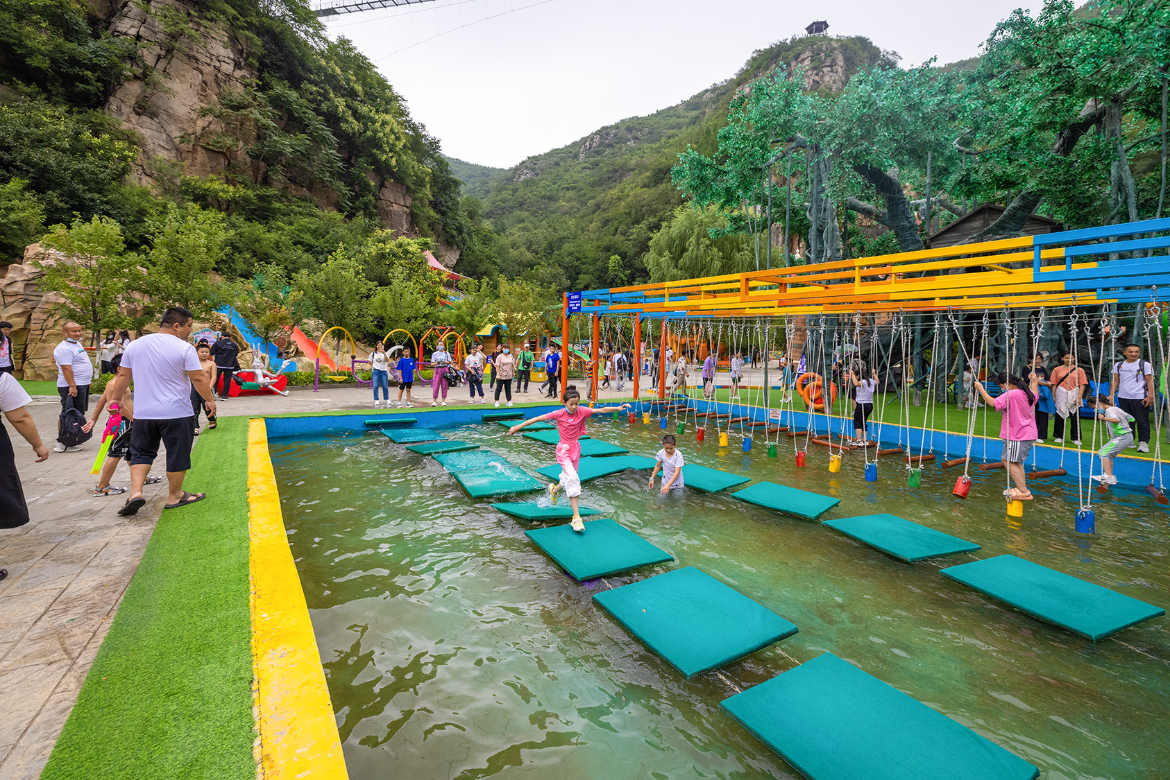 步入中华龙门、九龙壁、月老、财神、行禅栈道、玻璃栈道、锦绣宫、银河天街、银河飞瀑、观音圣坛、福地洞天等景点,点点出彩,吸引了众多游客。特别是亲子乐园里的滑世界、蜻蜓点水、勇士乐园、儿童溜索、网红秋千、樱花秋千、吊桩桥、古木秋千、魔幻城堡等体验元素,成了孩子们的快乐天堂。