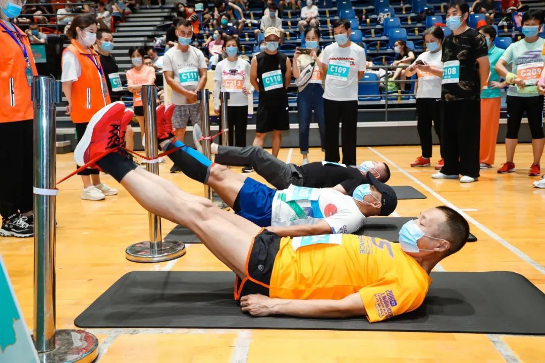 在仰卧举腿区记者看到,一名名参赛选手牟足了劲向上抬腿,一起一落把地板敲打得“砰砰”响。年近六旬的参赛选手俞立飚1分钟内完成了99个标准仰卧举腿,遥遥领先其他选手。