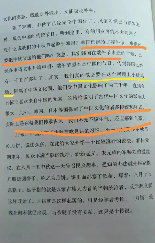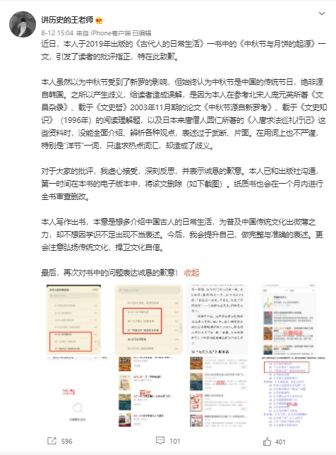 本人虽然以为中秋节受到了新罗的影响,但始终认为中秋节是中国的传统节日,绝非源自韩国。之所以产生歧义,给读者造成误解,是因为本人在参考北宋人庞元英所著《文昌杂录》、载于《文史哲》2003年11月期的论文《中秋节源自新罗考》、载于《文史知识》(1996年)的阅读理解题,以及日本来唐僧人圆仁所著的《入唐求法巡礼行记》这些资料时,没能全面介绍、辨析各种观点,表述过于武断、片面。在用词上也不严谨,特别是“洋节”一词,只追求热点词汇,却造成了歧义。
