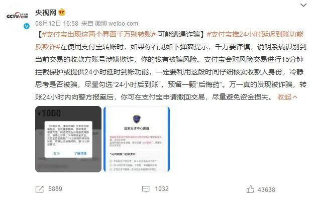 支付宝会对风险交易进行15分钟拦截保护或提供24小时延时到账功能。