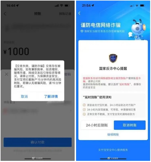 支付宝会对风险交易进行15分钟拦截保护或提供24小时延时到账功能,一定要利用这段时间仔细核实收款人身份,冷静思考是否被骗,尽量勾选“24小时后到账”,预留一颗“后悔药”。