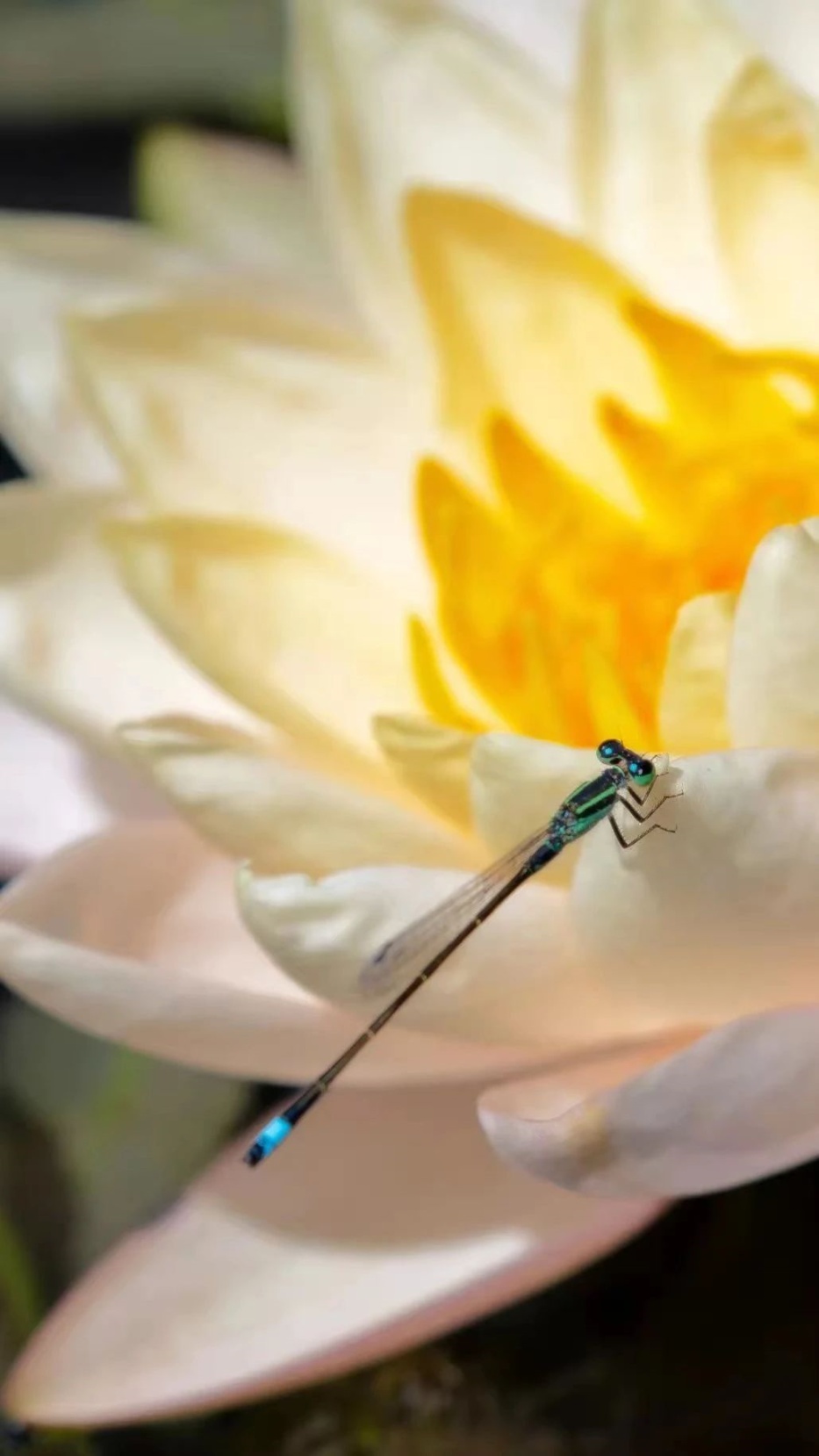 拍摄时可以选择一些动态物体当作陪体,例如花瓣上滑落的水滴,水上游过的动物,落脚休息的昆虫等。这样可以增加画面的灵动感,让人感觉画面“动”起来了。