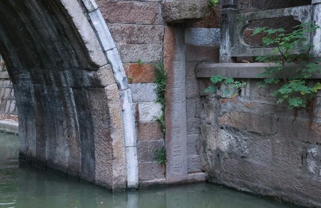 坐在舟里穿越百年的望仙桥,便来到了顾浦河。这座单孔石拱桥始建于明朝,清乾隆十八年重建。南北两侧桥联石分别刻有“星文遥泻汉,虹势尚凌虚”和“西望瑶池降王母,东来紫气满函关”。