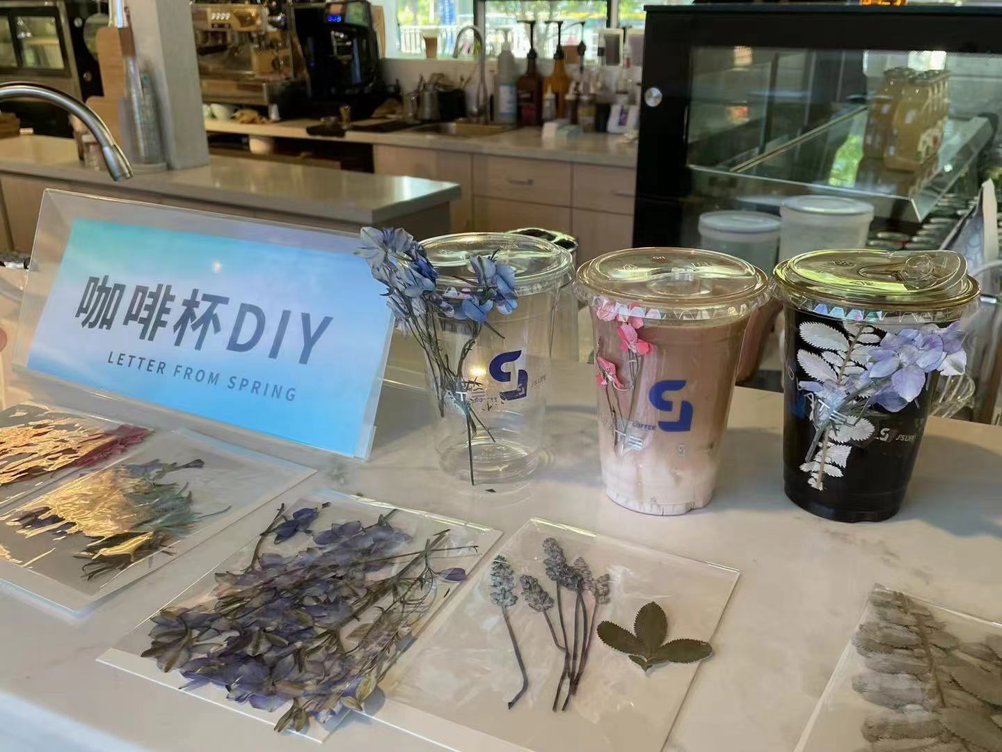 在观展过程中,还能参与咖啡杯DIY和扭扭花的工作坊互动体验活动,用干花和贴纸定制一款独一无二的咖啡杯,用扭扭棒制作一朵扭扭花,完成后可以将其带走,也可以贴到扭扭花墙上成为展览中艺术装置的一部分。