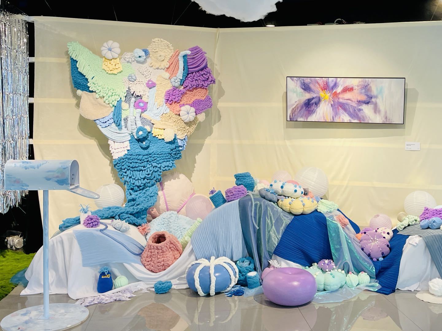 除了巨型花朵,艺术家还将回收布料与环保材料重新解构,制作成各式“海底珊瑚”,创造出一个斑斓的“海底珊瑚花园”。据介绍,装置灵感来源于珊瑚即将白化时得到保护而重生的景象,以此传递海洋环保、可持续发展理念。